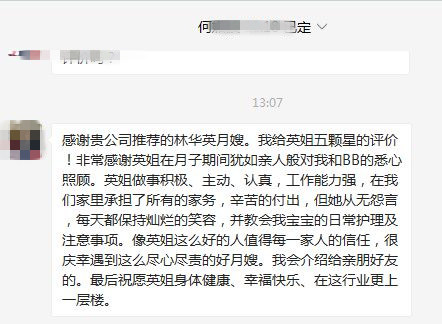 感謝貴公司推薦的林華英月嫂。我給英姐五顆星的評(píng)價(jià)!非常感謝英姐在月子期間猶如親人般對(duì)我和BB的悉心照顧。英姐做事積極、主動(dòng)、認(rèn)真,工作能力強(qiáng),在我們家里承擔(dān)了所有的家務(wù),辛苦的付出,但她從無(wú)怨言,每天都保持燦爛的笑容,并教會(huì)我寶寶的日常護(hù)理及注意事項(xiàng)。像英姐這么好的人值得每一家人的信任,很慶幸遇到這么盡心盡責(zé)的好月嫂。我會(huì)介紹給親朋好友的。最后祝愿英姐身體健康、幸??鞓?lè)、在這行業(yè)更上一層樓。